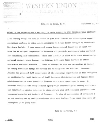 The story of Hurricane Beulah has three chapters. Hurricane alerts, preparation and arrival of the storm itself comprise the first. Devastating floodwaters which swept whole houses down the Arroyo Colorado and took highway and railroad bridges out to sea form Chapter 2. And the third, actually the most significant, is the vigor and determination with which the entire Valley launched recovery operations.