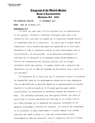 Photograph of Kika de la Garza with President Lyndon B. Johnson during the assessment of damage caused by Hurricane Beulah