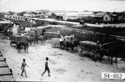 Missouri Pacific Rail Yard located in McAllen, Texas. Wagons carrying broom corn can be seen in the foreground.