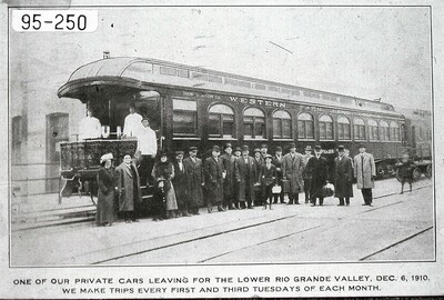 [Pharr] Photograph of Western Farm Land Railway Car (95-250 P-11). (1910) Series VI: Archives Alert, 1888–1983. Hidalgo County Historical Commission Collection, ELIBR-0079. The The University of Texas Rio Grande Valley Special Collections and Archives, Edinburg Campus. UTRGV Digital Library. https://scholarworks.utrgv.edu/hidalgohist_aa/273