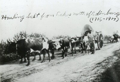 Salt wagon train with oxen. "Hauling salt from lakes north of Edinburg."