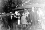 Albert and Franklin Ewers with men and boys leaning against an automobile.
