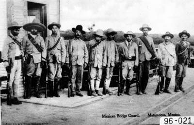 [Matamoros] Photograph of Mexican Bridge Guard (96-021). (n.d.) Series VI: Archives Alert, 1888–1983. Hidalgo County Historical Commission Collection, ELIBR-0079. The University of Texas Rio Grande Valley Special Collections and Archives, Edinburg Campus. UTRGV Digital Library. https://scholarworks.utrgv.edu/hidalgohist_aa/542