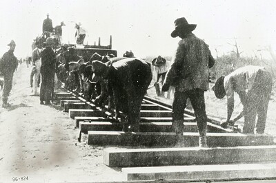 [Edinburg] Photograph of Railroad Construction Crew Laying Tracks for San Antonio & Rio Grande Railway (96-824). (1909) Series VI: Archives Alert, 1888–1983. Hidalgo County Historical Commission Collection, ELIBR-0079. The University of Texas Rio Grande Valley Special Collections and Archives, Edinburg Campus. UTRGV Digital Library. https://scholarworks.utrgv.edu/hidalgohist_aa/700