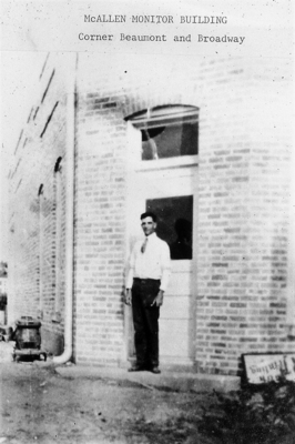 Izador Moritz posing in front of McAllen Monitor building on Corner Beaumont and Broadway.