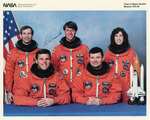 Color photograph. Autographed photo of NASA Space Shuttle Mission Crew, including commader Col. Kenneth D Cameron, pilot Mr. Stephen S. Oswald, and mission specialists Mr. Kenneth D. Cockrell, Dr. Micheal Foale, and Dr. Ellen Ochoa.