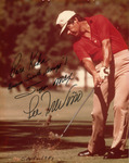 Color photograph. Lee Treviño swinging a golf club. Photograph is signed by Lee Treviño with the message: "Para Kika 'Buena suerte, amigo!' Super Mex, Lee Treviño". Dated September 1981.