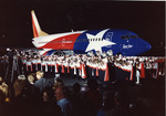 Color photograph. Display of the Southwest Airlines Lone Star Plane. A marching band performing in front of the plane for a crowd of people.