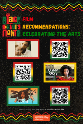 Collection of posters created celebrating Black History Month 2026. It highlights films, books, and archival materials that celebrate Black arts, storytelling, leadership, and local history. The posters also showcase streaming films with public performance rights, literature, biographies of influential figures, and archival profiles of African American educators from the Rio Grande Valley/