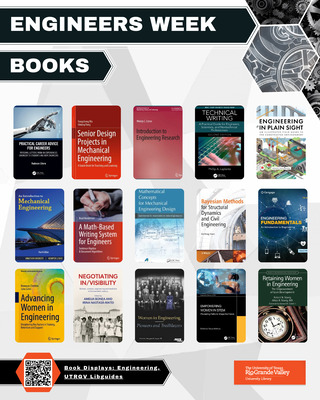 Poster showing a curated selection of engineering‑focused resources that showcase student research, faculty scholarship, and U.S. government information. This poster features selected books, open‑access UTRGV theses and dissertations, peer‑reviewed articles, and educational resources that support engineering education, research, and innovation.