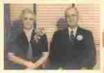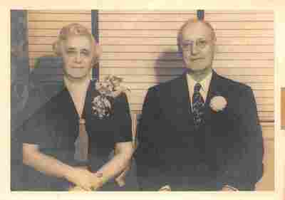 Black and white photograph of an unidentified couple seated (possibly a wedding anniversary photo). Woman wears a large corsage on her left shoulder. Man wears glasses, a dark suit and tie, and a flower on his left lapel. Photo is creased.