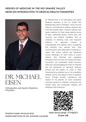 Dr. Michael Eisen is an Orthopedics and Sports Medicine physician at the UT Health RGV Multispecialty clinic in Harlingen, Texas. His work reflects a commitment to patient-centered care in the Rio Grande Valley. Trained in primary care sports medicine, Dr. Eisen treats patients across all ages, addressing injuries, chronic pain, and muscular and skeletal conditions with an emphasis on listening, trust, and long-term wellness. His approach consists of understanding each patient’s story, recognizing that eYective care requires time, clear communication, and collaboration. Practicing in a region with unique cultural and healthcare access challenges, Dr. Eisen works to ensure patients feel informed and supported throughout their recovery. He values prevention, movement, and sustainable health practices, while also acknowledging the limits of medicine and the importance of teamwork between himself and the patient. Dr. Eisen is often remembered by patients due to his empathetic bedside manner and ability to listen to patients’ issues. Through humility, consistency, and respect for his patients, Dr. Eisen represents everyday heroism in medicine, serving the Rio Grande Valley with compassion, integrity, and dedication that it deserves.